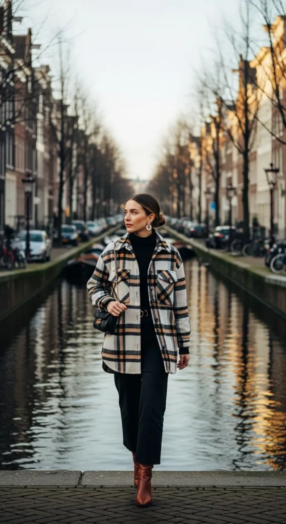 A turtleneck under a plaid shacket gives a warm layered look that feels grounded and easy. Straight black pants sharpen the silhouette.