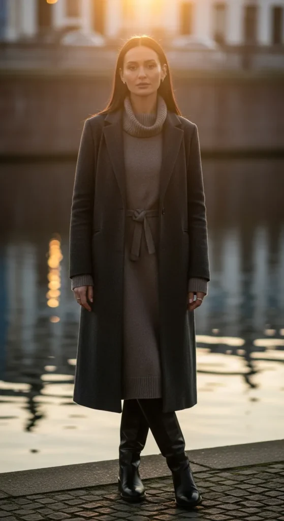 A turtleneck sweater dress creates instant elegance. Paired with a long tailored coat and knee boots, it gives an upscale yet effortless Amsterdam winter vibe.