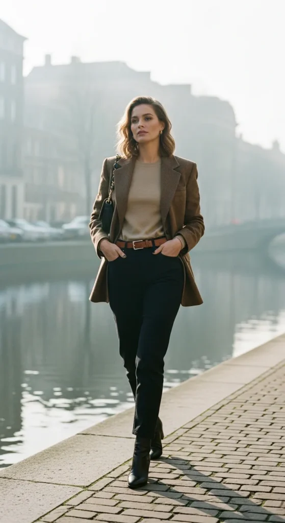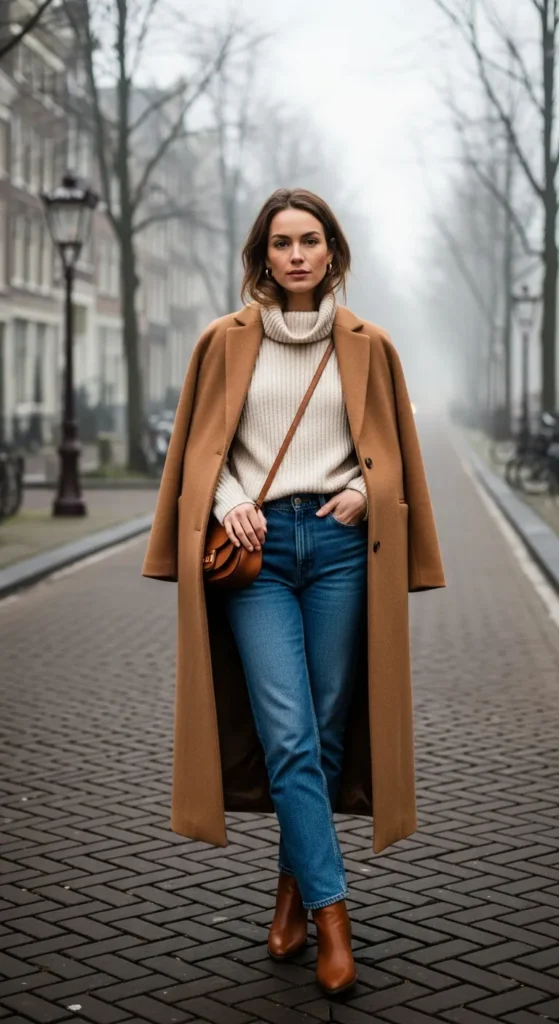 A long wool coat layered over a soft cream turtleneck feels instantly comforting against Amsterdam’s winter breeze. Straight jeans keep things grounded and real, giving a relaxed but intentional silhouette perfect for wandering canals.