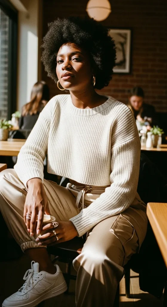Unexpected and chic — a cropped knit with satin cargo pants blends casual comfort with subtle shine.