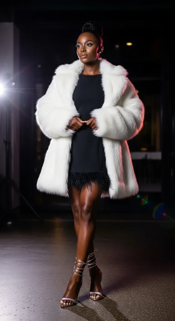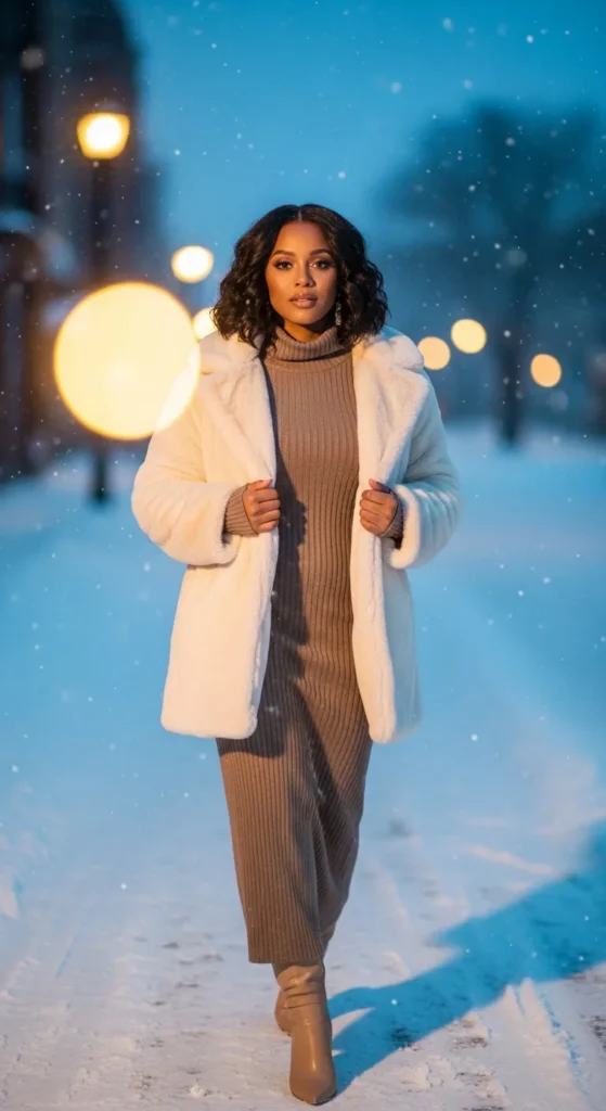 A ribbed turtleneck maxi dress paired with a plush faux fur coat gives effortless winter chic. Ideal for dinner or rooftop drinks, it’s warm, flattering, and endlessly feminine.