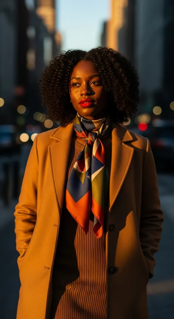Stylist Suggestion: Add a bright lip to echo the scarf’s color — it ties the whole look together visually and energetically.