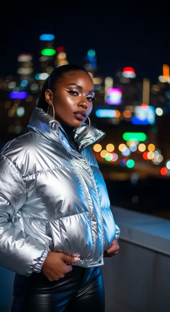 Go bold with a metallic puffer and faux leather pants. It’s edgy, warm, and ready for rooftop nightlife.