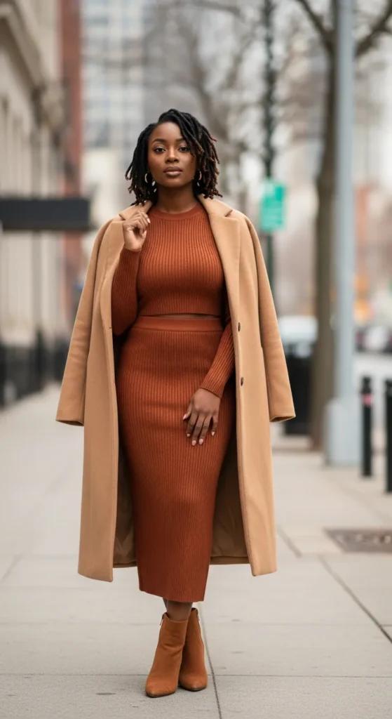 Go tonal with a matching knit top and skirt set, elevated by a dramatic coat — think camel, rust, or chocolate. Cozy yet elevated.