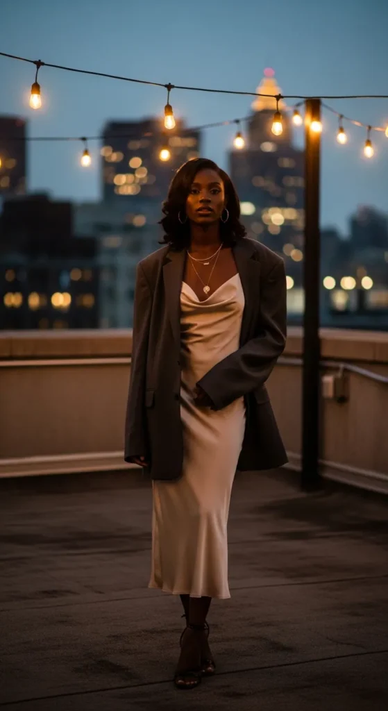 Layering done right — an oversized blazer over a satin slip dress mixes soft and structured. Ideal for winter date nights or chic dinner parties.