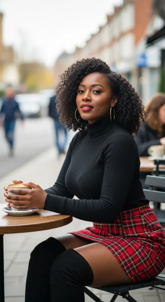 Playful yet polished — a plaid mini skirt with a cozy fitted sweater and tall boots delivers effortless birthday charm.