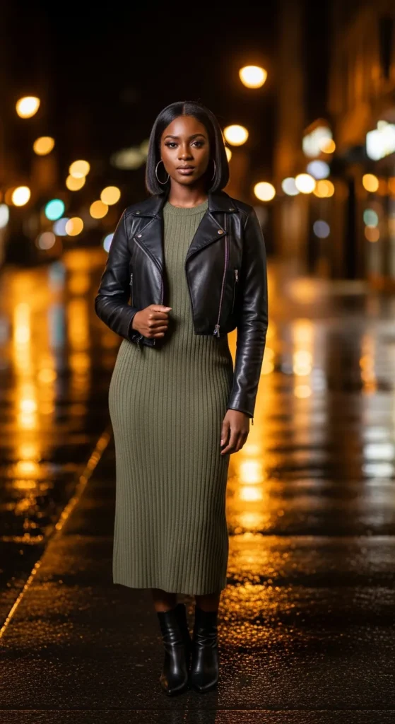 A ribbed knit dress paired with a cropped leather jacket keeps your shape visible while adding edge — perfect for dinner-to-dance transitions.