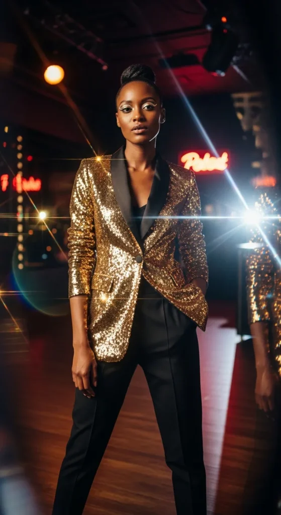 Turn heads with a sequin blazer over sleek trousers. It’s power and party rolled into one.