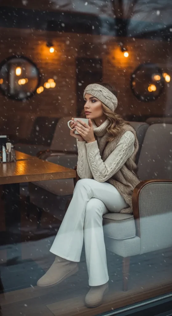 A cable-knit turtleneck with white flare pants and a faux-fur vest—après-ski without the slopes. Add suede ankle boots for cozy glamour.
