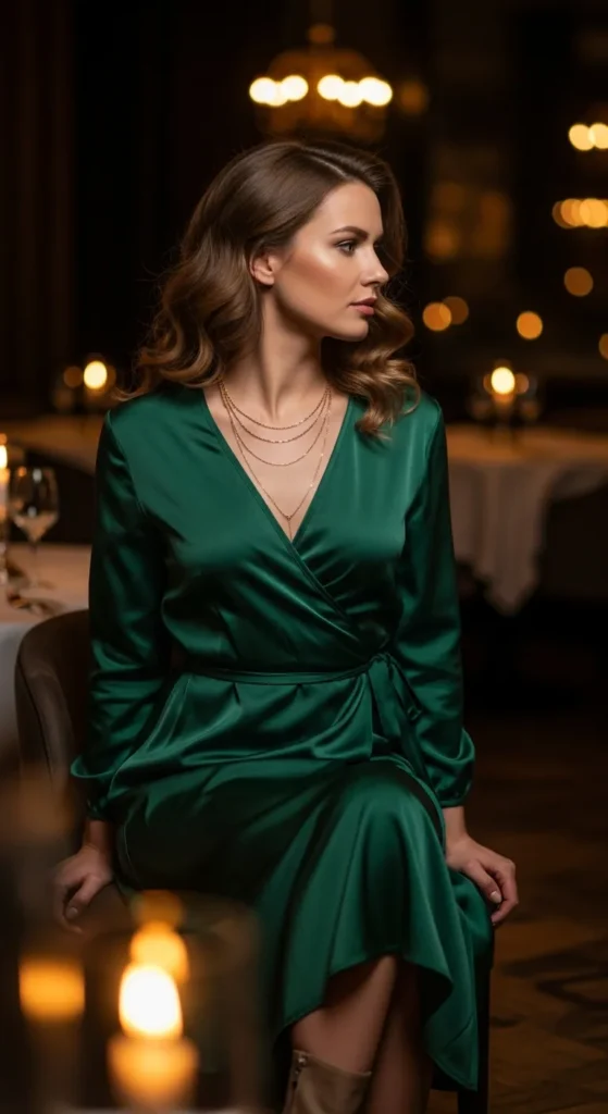 A long-sleeve silk wrap dress in forest green or plum paired with heeled ankle boots radiates understated glamour. Perfect for dinner parties and warm-lit evenings.