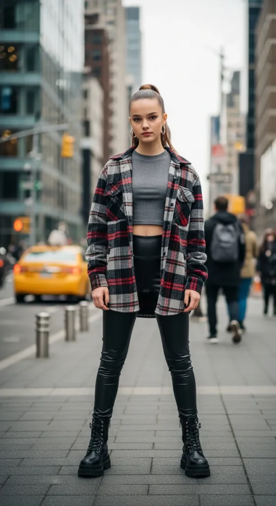 A ribbed crop top under a plaid shacket and faux leather leggings—trendy yet warm. Finish with combat boots for that cool-girl confidence.
