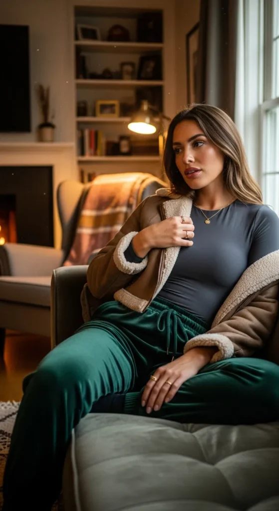 A pair of plush velour joggers with a fitted bodysuit and cropped shearling jacket. Cozy, elevated, and perfect for intimate gatherings.