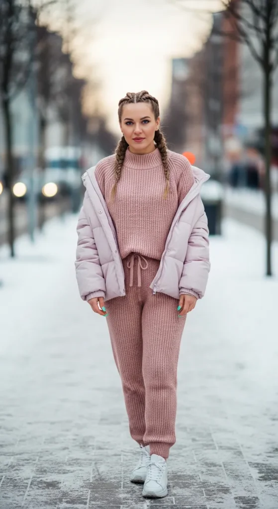 A pastel puffer over a knit set—effortless but undeniably stylish. Ideal for daytime hangouts when you want warmth without losing the vibe.