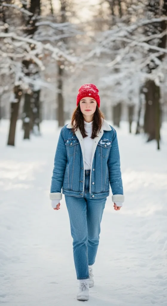 Pair a fitted white turtleneck under a sherpa-lined denim jacket with straight-leg jeans and white sneakers. Add a bright beanie for a cheerful twist.