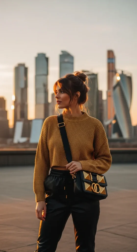 A golden cropped sweater paired with black faux-leather joggers brings glam-meets-grunge energy. Perfect for rooftop hangouts or late-night birthday strolls.
