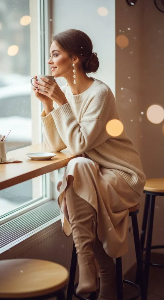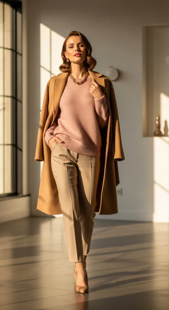 Mix beige trousers with a blush cashmere sweater and a structured coat. Neutral tones elevate your winter birthday look while staying effortlessly soft.