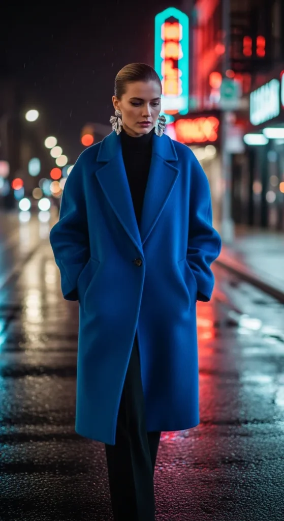 A cobalt wool coat over an all-black outfit creates a striking winter statement. Perfect for birthday nights that call for color confidence.