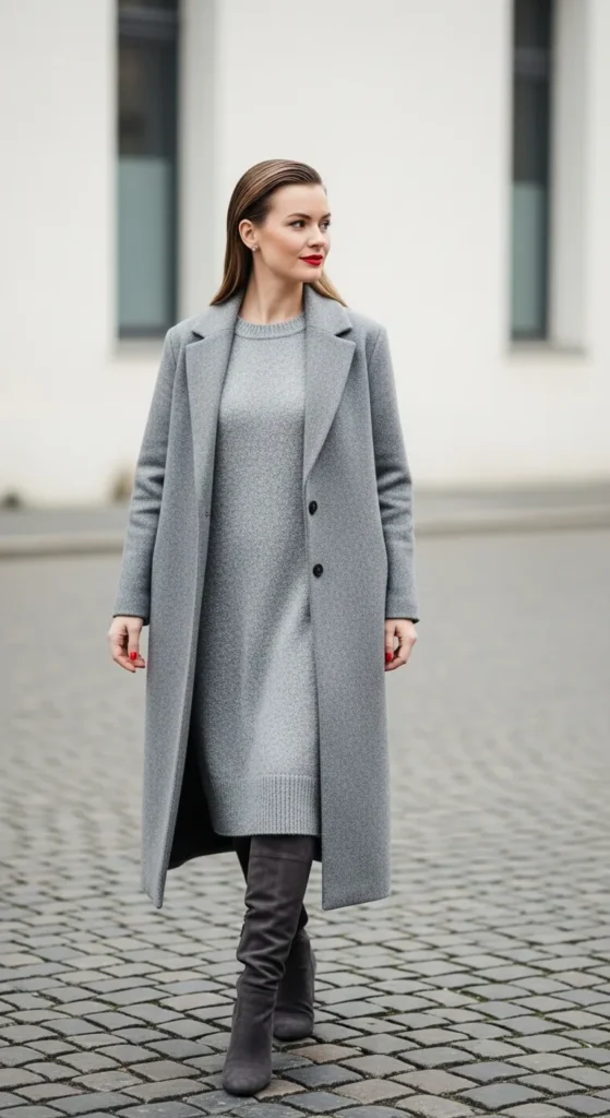 Go all grey—different tones, same softness. Mix a wool coat, knit dress, and suede boots. It’s modern minimalism at its coziest.