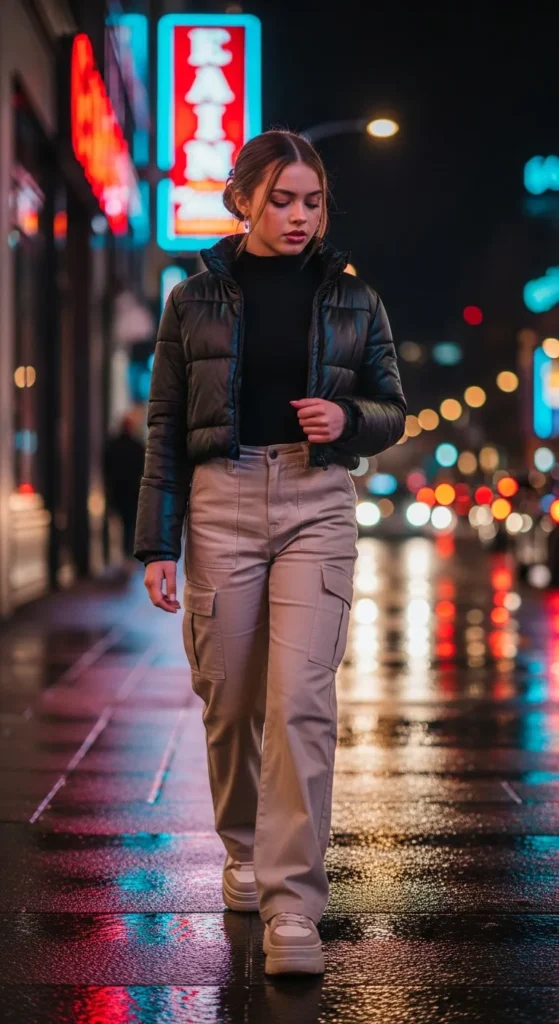 High-waisted cargo pants with a cropped puffer jacket and fitted turtleneck create a confident, downtown edge. Add statement sneakers for personality.