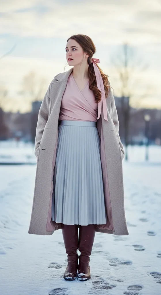 Pair a blush wrap top with a grey pleated skirt and knee-high boots. Add a long wool coat for balance—soft yet structured.