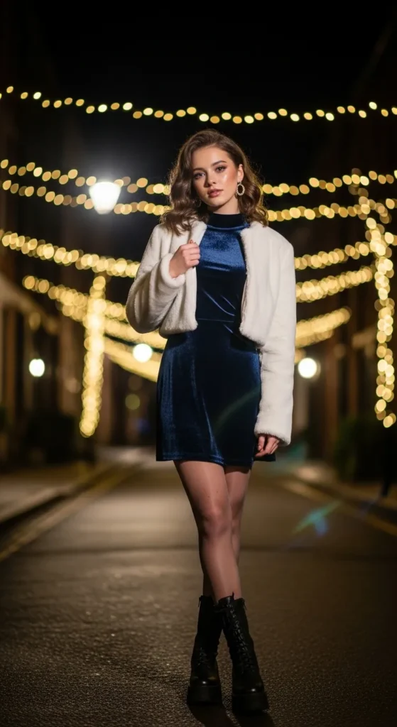 A midnight-blue velvet mini dress layered with a cropped faux-fur jacket gives instant glam. Add sheer black tights and chunky platform boots for a bold, cinematic winter vibe.