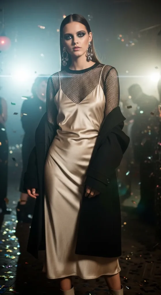 A satin slip dress layered over a fitted long-sleeve mesh top—feminine and sleek. Add a wool coat and ankle boots for texture balance.