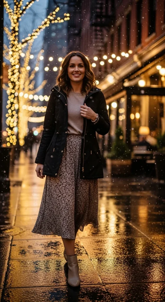 A black jacket styled with a soft top and midi skirt feels romantic yet relaxed, perfect for winter coffee dates or evening walks.