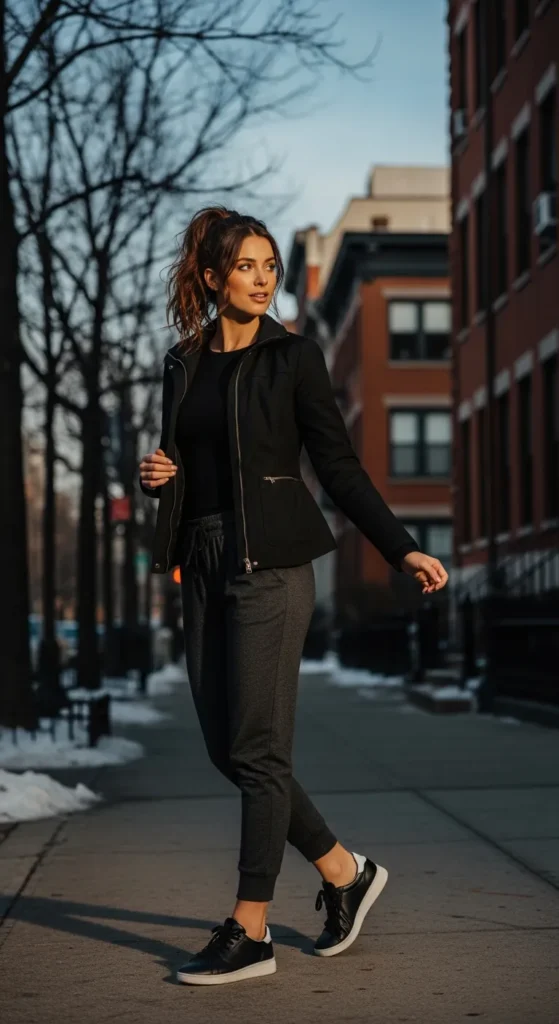 A black jacket with jogger-style pants and a fitted top gives a sporty edge that still feels intentional and winter-appropriate.