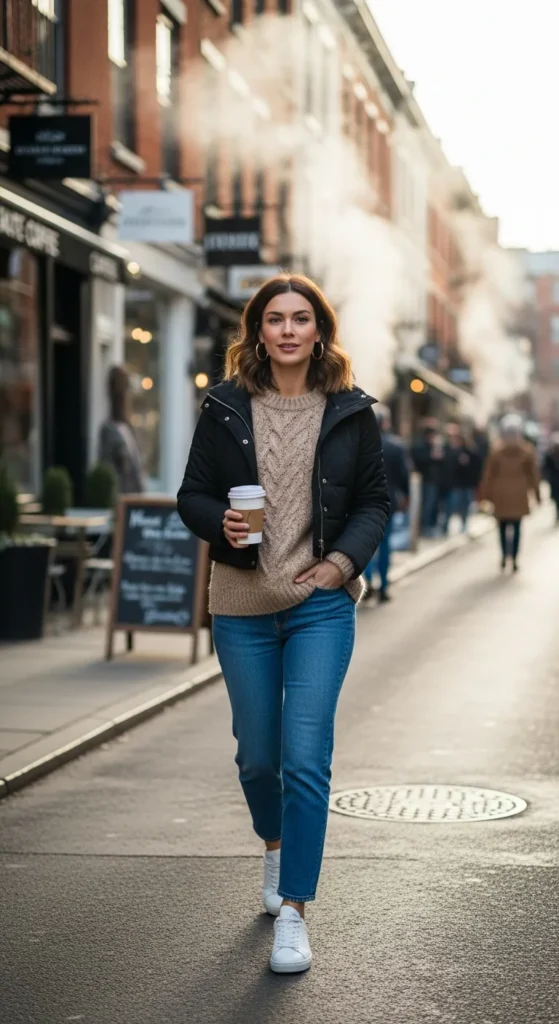 A cropped black jacket layered over a soft beige knit and straight blue jeans feels effortless yet intentional. It’s the kind of outfit that makes you walk a little taller during chilly morning errands.