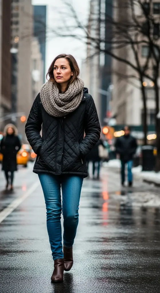 A black jacket styled with a soft scarf, slim jeans, and a simple knit creates that cozy street-style feeling we all crave when temperatures drop.