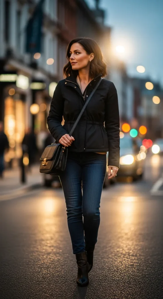 A black jacket over a fitted top and dark jeans feels perfect for casual dinners, balancing warmth and subtle elegance without looking overdone.