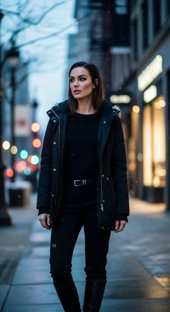 A black jacket paired with dark layers and simple accessories feels calm and confident, ideal for quiet winter nights and reflective walks.