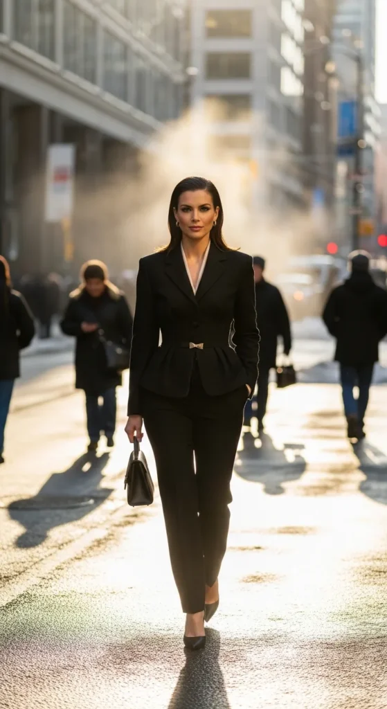 A structured black jacket layered with a soft blouse and straight trousers feels calm, capable, and professional without feeling stiff or outdated.