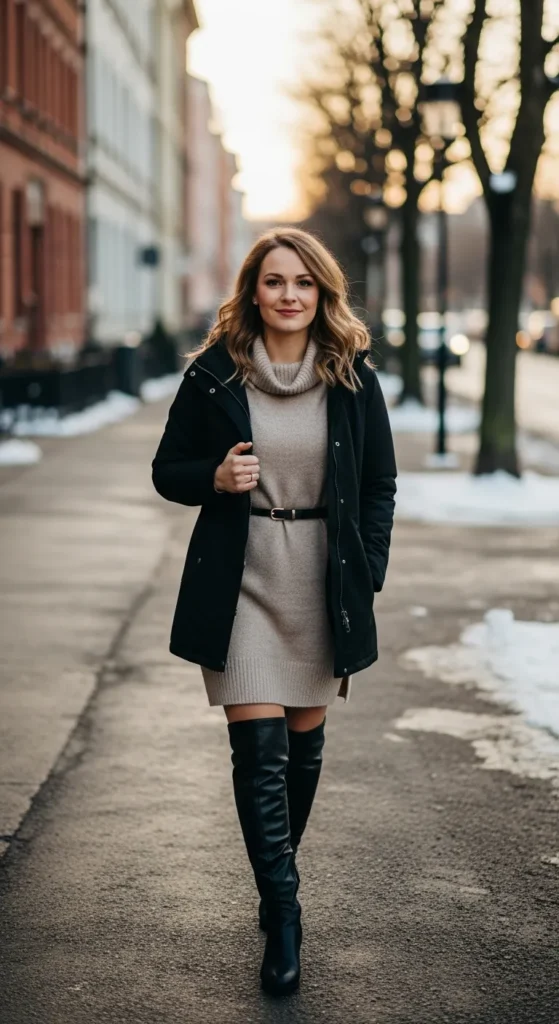 A black jacket over an oatmeal sweater dress feels calm and grounded, perfect for days when you want warmth without heavy layers. The contrast keeps it visually interesting yet gentle.