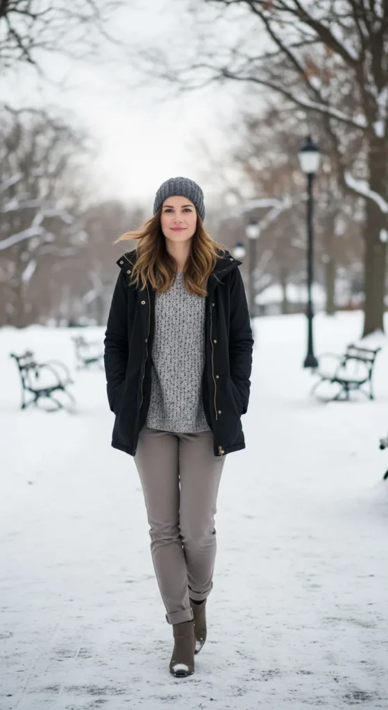 Stylist Suggestion: Add a neutral beanie and simple studs. The beanie adds warmth and texture, while minimal jewelry keeps the outfit clean.