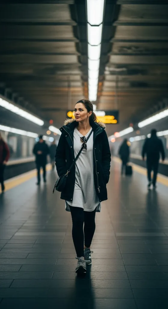 A black jacket layered with a longline tee and leggings is practical, warm, and comfortable for winter travel while still looking pulled together.