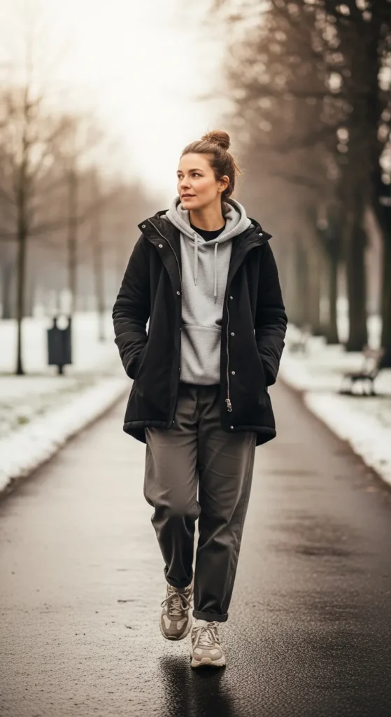 A black jacket over a sweatshirt and relaxed trousers feels like a deep exhale after a long week, casual yet thoughtfully styled for winter outings.
