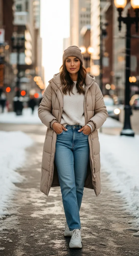A long-line puffer with a soft, marshmallow feel, straight-leg jeans, and chunky sneakers that make city walking feel easy. This look balances warmth and confidence without trying too hard.