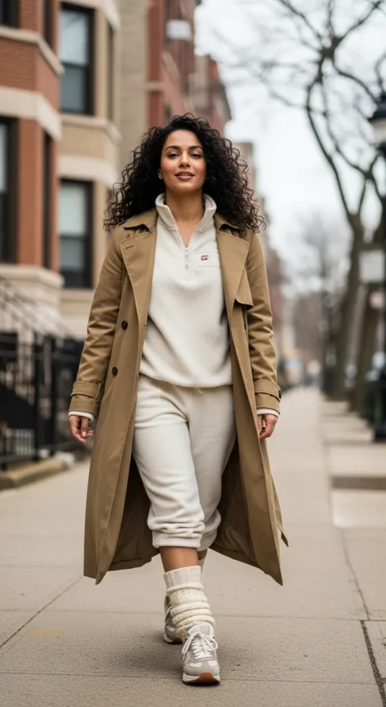 A matching fleece sweat set under a long trench with winter-ready sneakers. Casual but strangely chic when layered right.