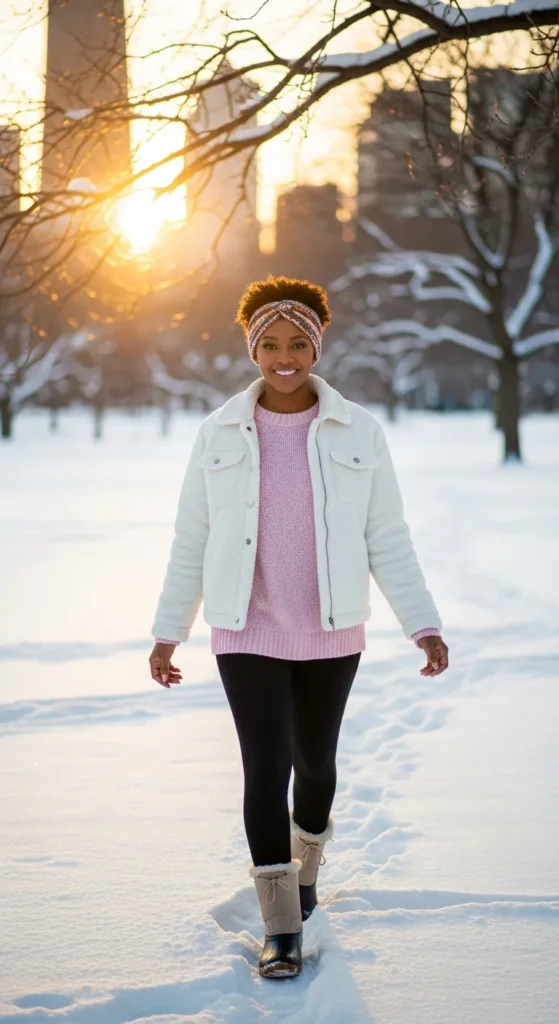 A sherpa jacket, pastel knit, thermal leggings, and rubberized winter boots perfect for snowy sidewalks.