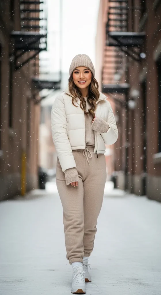 A cropped padded jacket, fleece-lined joggers, and winter sneakers with a knit beanie. Cute and warm for weekend exploring.