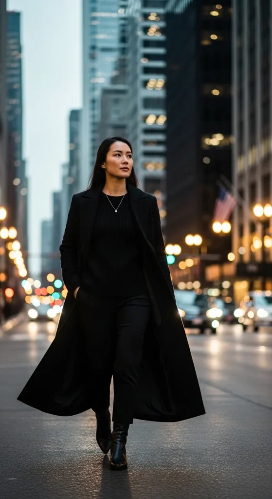 A long black wool coat, black knit top, black straight trousers, and sleek black boots. Minimalist and timeless.
