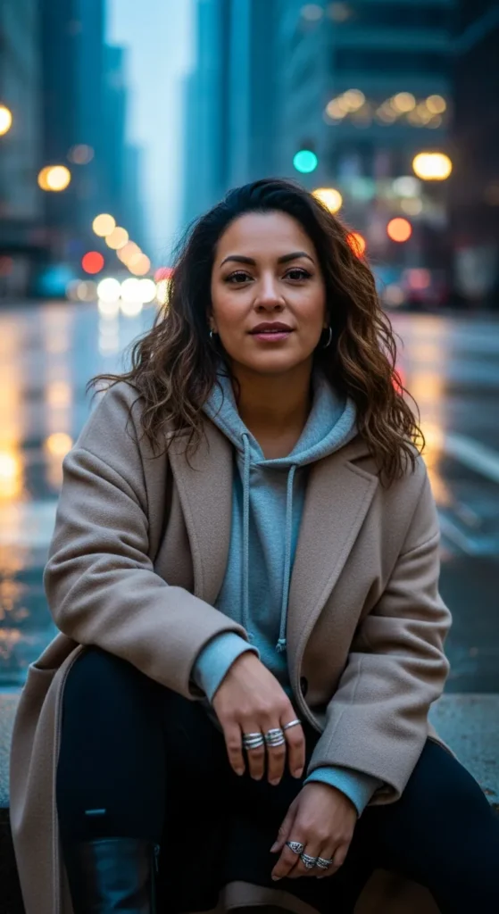 Hoodie under a wool coat with leggings and platform boots. Street-chic and endlessly comfortable.