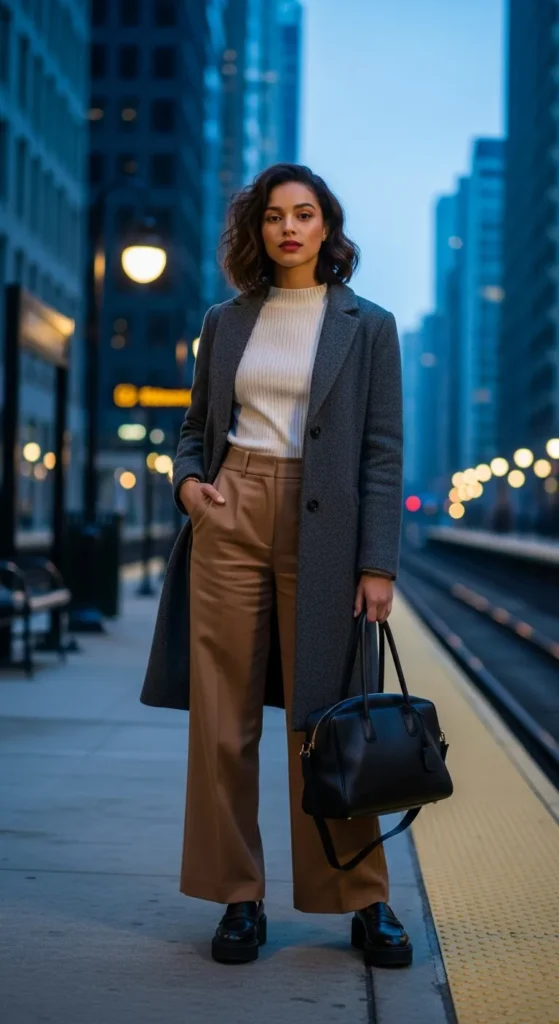 A slouchy wool coat tossed over a ribbed mock-neck top, wide-leg trousers, and platform loafers. It’s warm enough for the outdoor walk yet polished enough for hopping on the CTA.