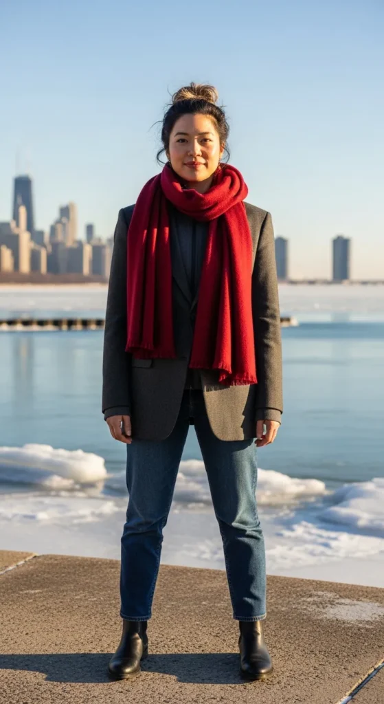 Stylist Suggestion: Opt for a bold-colored scarf to contrast the neutral blazer, giving the look personality without sacrificing warmth.