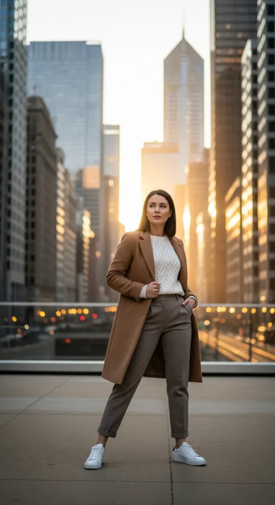 A crisp structured coat, simple white knit, straight trousers, and clean leather sneakers. Effortlessly modern.