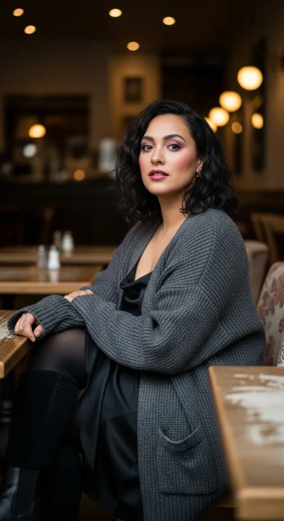 A soft oversized cardigan layered over a dark slip dress with fleece tights and ankle boots. Romantic but grounded.