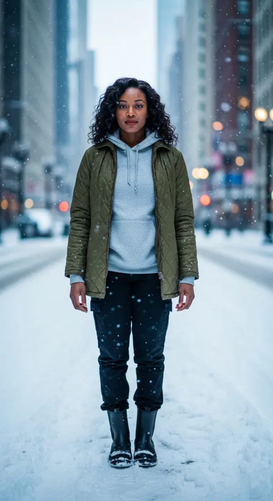 A quilted jacket, thermal hoodie, black cargo pants, and waterproof lug boots. Made for slushy sidewalks.