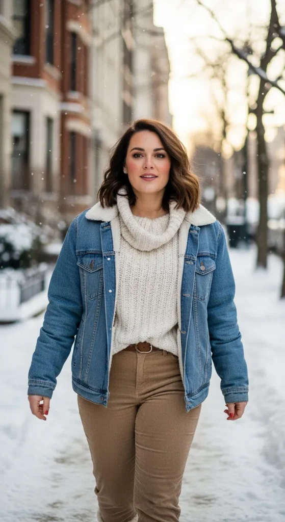 A fleece-lined denim jacket layered over a chunky knit with corduroy pants and sherpa boots.