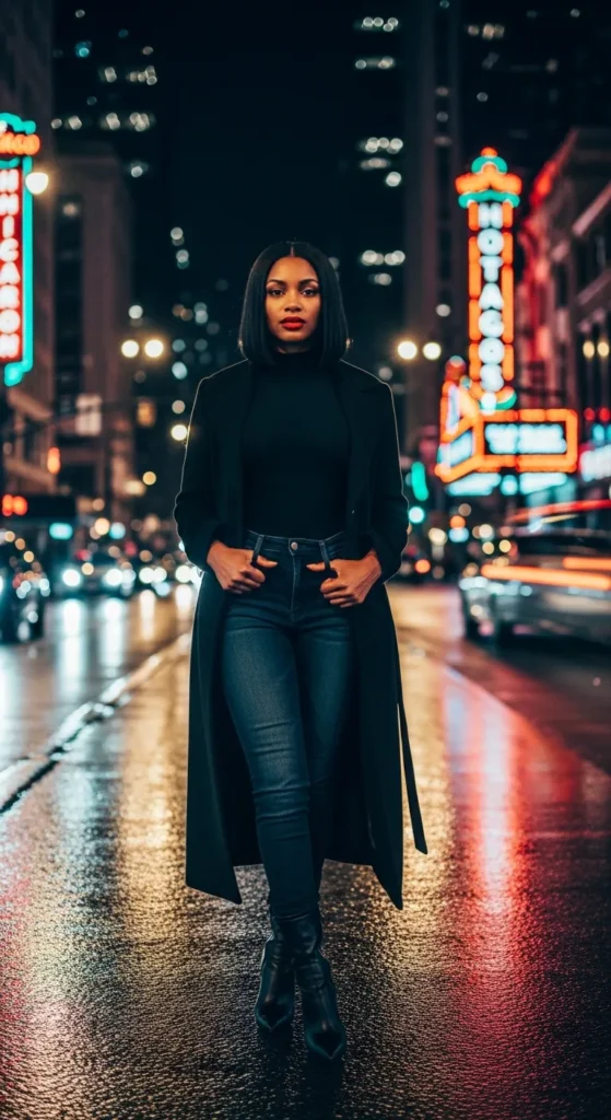 A sleek long coat over a fitted turtleneck bodysuit and dark straight jeans with heeled booties.